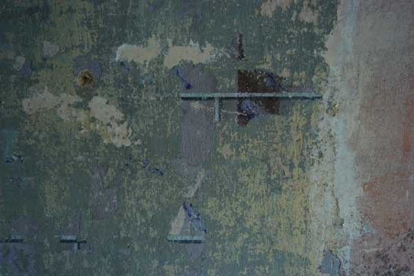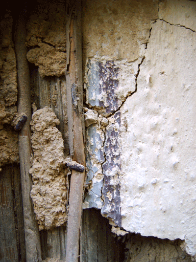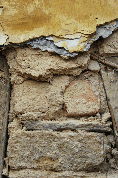 Dieses Bild zeigt eindrucksvoll, wie viele Schichten Kalkanstriche auf der Fassadenverputzung vorhanden waren. Erkennbar ist auch, dass zuerst eher graue Töne in Mode waren, bevor später hauptsächlich ockergelbe Anstriche folgten. Insgesammt kommt man sicherlich auf 20-