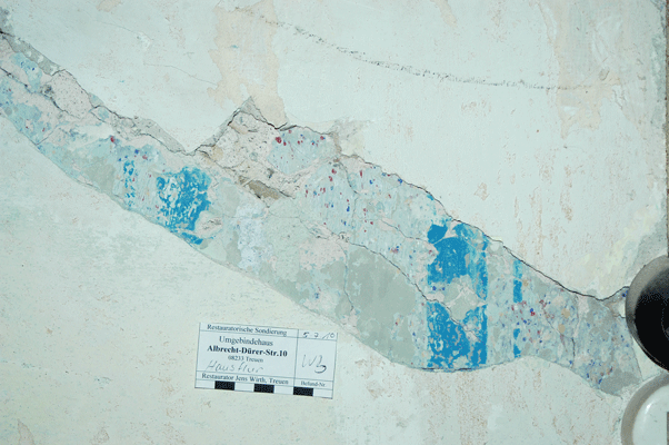 Nach mehreren Putzreparaturen und Zwischenschichten lässt sich schließlich noch eine Sockelgestaltung finden, welche wahrscheinlich um 1930 entstanden ist. Dabei wurde ein recht hoher Ölsockel angelegt mit grüner Grundfarbigkeit und kräftig gelben und braunen waagerechten Strichen (Foto 4 im Bereich der Treppe)