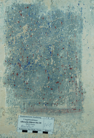 Später, etwa zu Beginn der zweiten Hälfte des 19. Jhd.´s sind dann die Fachwerkwände innen komplett verputzt worden. Dafür wurden die Lehmgefache oft eingehackt und auf den Hölzern Schilfrohr befestigt, um den Kalkputz zum halten zu bekommen. Auf dieser historischen Putzschicht finden sich nun wieder mehrere gestaltete Farbfassungen. Am interessantesten erscheinen dabei ein grauer Anstrich (um 1860/70) mit rotem und blauem Spritzmuster (Sprenkeltechnik -