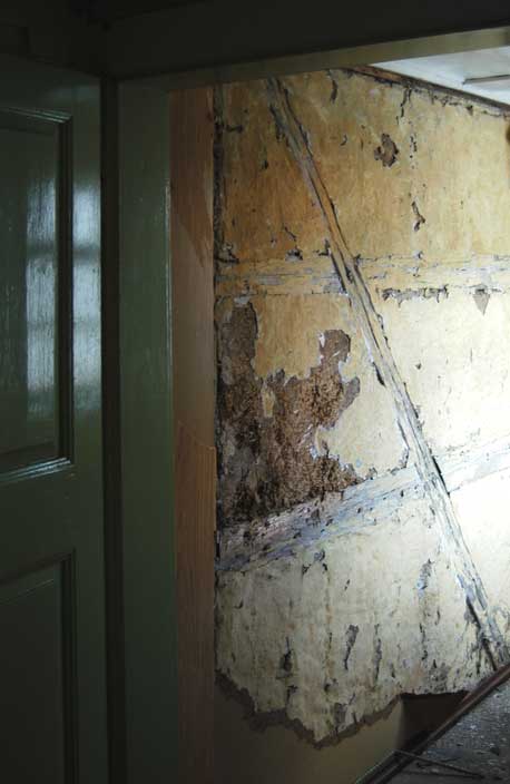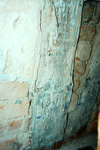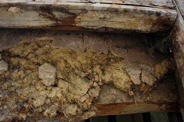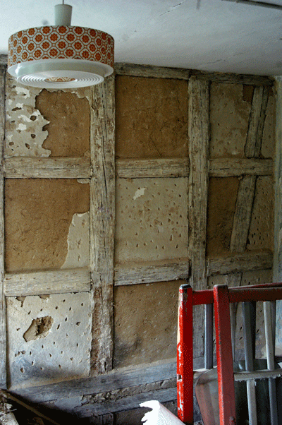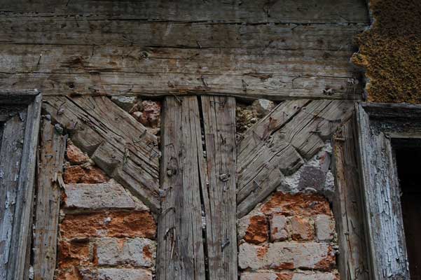 Erkennbar sind die relativ schwachen Fachwerkhölzer (wie im ganzen „Anbau“, dazwischen die Strohlehmausfachung.