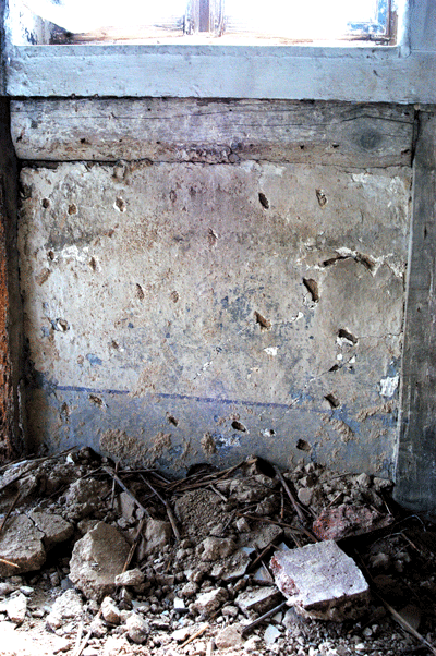 Beim Entfernen erster Putzschichten an der stark in Mitleidenschaft gezogenen nordöstlichen Gebäudeecke machten wir eine recht überraschende Entdeckung.