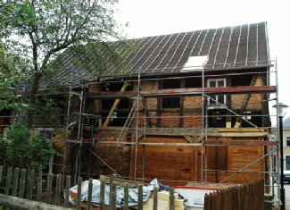 Immer das Jahresziel vor Augen, die nördliche Dachhälfte dicht zu bekommen (trotz der „Notsicherung“ 2004/05 hatte es immer wieder reingeregnet) sind wir wieder ein paar wichtige Schritte weitergekommen. Um ein Gerüst zu stellen, musste zunächst der Boden begradigt werden, der Erdaushub war ohnehin nötig, da das Gelände viel zu hoch ans Gebäude angeschüttet war. Nach Entfernen der Verbretterungen an der Laube sowie der Verschalung des ehemals verschieferten Obergeschosses bietet sich nun ein schöner Blick auf das freiliegende Fachwerkgefüge.