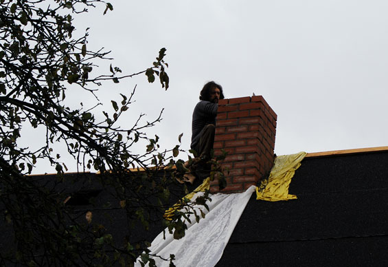 Nachdem wir es sogar noch in einer Wochenendschnellaktion geschafft haben, den Schornstein neu aufzumauern (man hatte ihn im Rahmen der Notsicherung 2004 einfachheitshalber abgerissen), sollte nun gleich anschließend das Dachdecken beginnen. Das hat sich bei diesen Witterungsbedingungen jedoch erstmal erledigt.