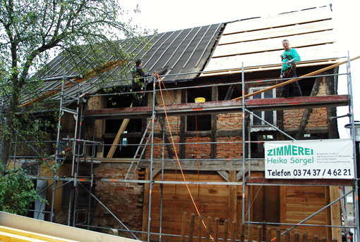 Auf dem Foto sind die ersten Bahnen der neuen Blechdachdeckung zu sehen. Hoffentlich spielt das Wetter noch ein bischen mit...