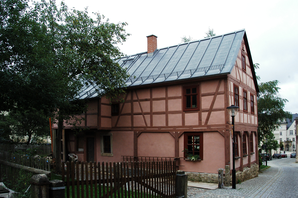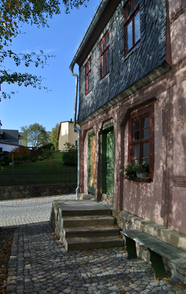 Solche zweiläufigen Treppen findet man häufig in Treuen an Häusern ähnlicher Bauart, auch bietet sich so ein besserer Aussichtspunkt in das höher gelegene Schaufenster. Der Weg neben der Treppe bis hin zur Hauseingangstür bzw. zur Gartenlaube wurde gepflastert. Endlich kommt man ins Haus, ohne durch den Schlamm zu stapfen! Nun fehlt nur noch die Anlage des kleinen Gärtchens an der Straße…
