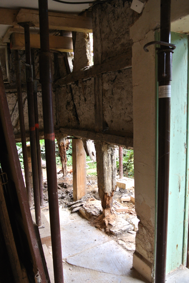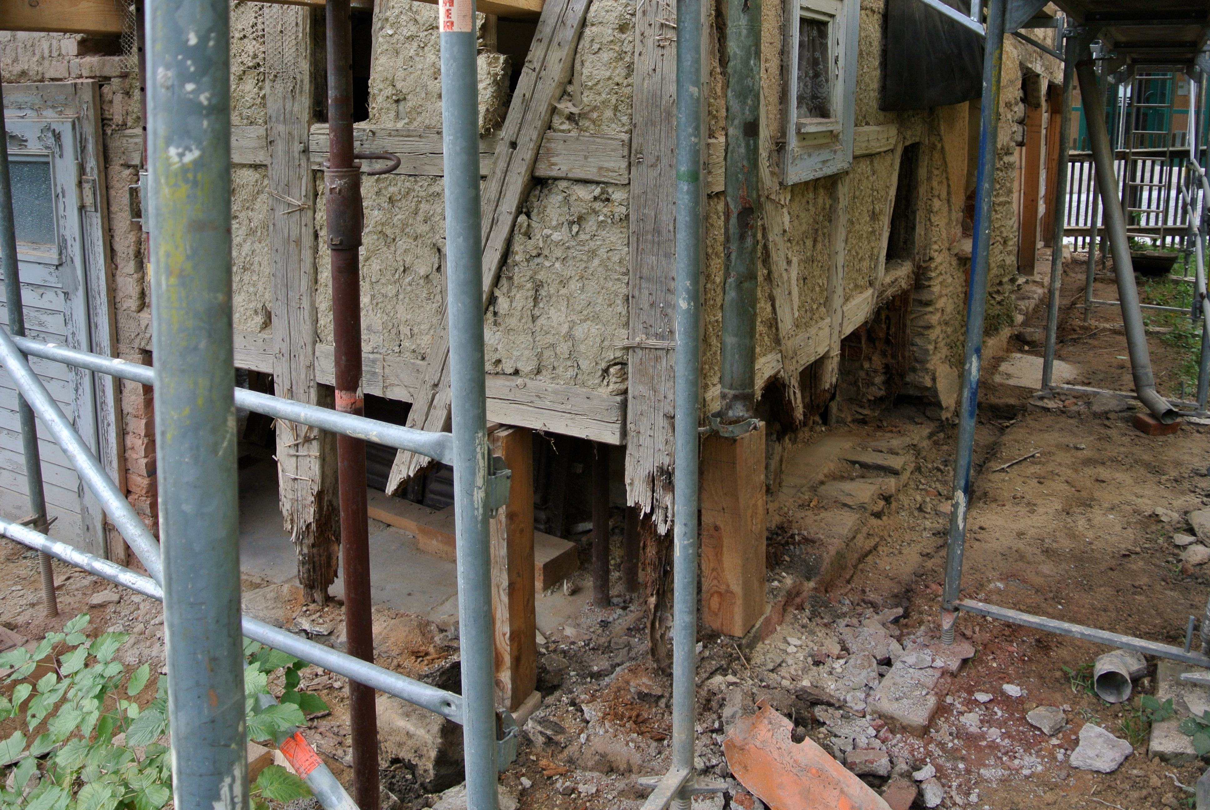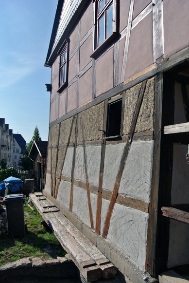 , nach dem Entfernen der unteren Gefache, welche zum großen Teil schon im jüngerer Zeit aufgemauert bzw. „betoniert“ worden waren. Die ehemaligen Fachwerkständer kann man nur noch erahnen. Da das Haus in diesem Zustand quasi schwebt, musste vor Beginn der Arbeiten natürlich innen und außen kräftig abgestützt werden, was man ebenfalls auf dem Bild gut erkennt.