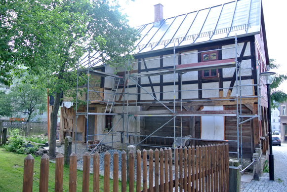 Schließlich konnten wir also Mitte des Jahres die Nordseite und auch den hinteren, östlichen Giebel von Haus Nr. 12 einrüsten -