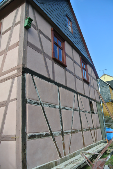 Das zweite Bild zeigt die fertig gekalkten Gefache, die Fachwerkhölzer warten hier noch auf ihren Anstrich, der wie immer aus zwei Schichten Ölfarbe und einem farblosen Firnisüberzug besteht.