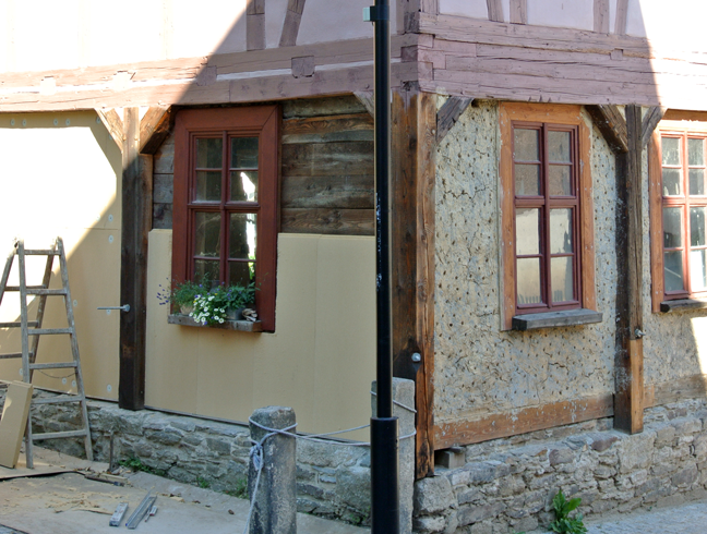Auch die Zimmerleute kamen natürlich nicht auf Abruf (die Frühlingsflut verschärfte die Auftragssituation der hiesigen Handwerker noch), aber dann, endlich, im Oktober(!) wurden die Reparaturen am Fachwerk von Haus Nr. 12 an den beiden Gartenseiten durchgeführt und das Haus stand endlich wieder auf sicheren Beinen.
