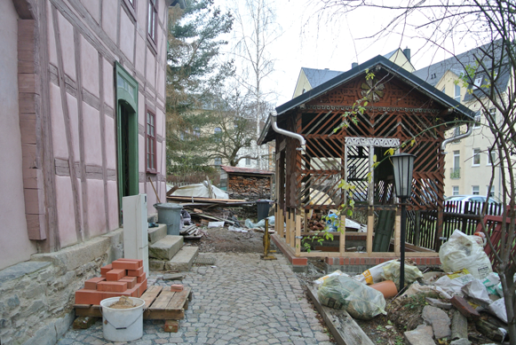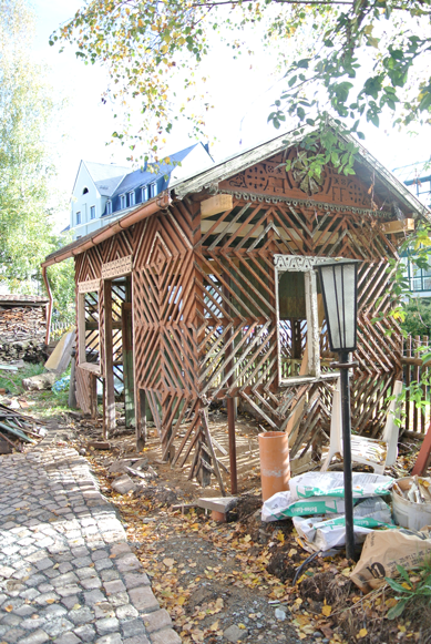 Etwas überraschend ergab sich für uns in diesem Jahr die Möglichkeit, ein weiteres Teilprojekt in Angriff zu nehmen. Auf dem Grundstück des Hauses Nr. 10 steht auf der stadtzugewandten Seite eine historische Gartenlaube, welche anhand der eingesägten Initialen (Foto siehe „Vorbesitzer“) auf eine Bauzeit zwischen 1876 und 1892 datiert werden kann, demnach also etwa 130 Jahre alt ist. Ein Abriss der arg baufälligen „Schupf“ wäre für uns nicht in Frage gekommen, eine Restaurierung stand jedoch derzeit ebenfalls nicht zur Debatte, mussten doch zunächst vorrangig die beiden Haupthäuser in einem bestimmten Zeit-