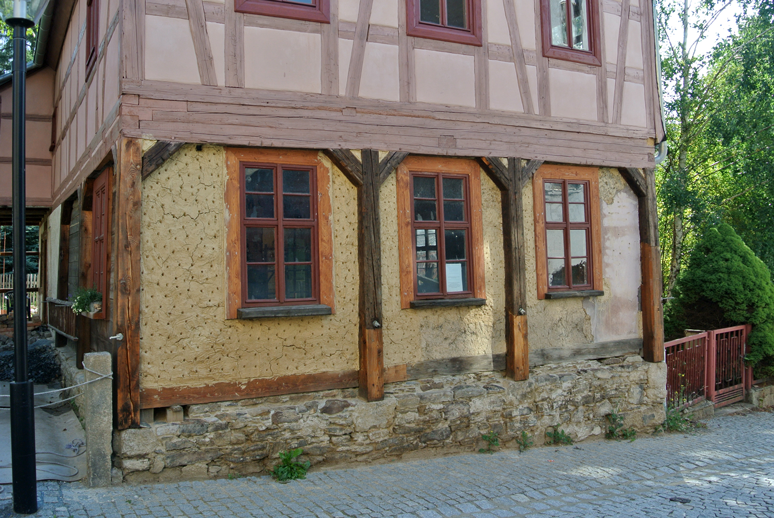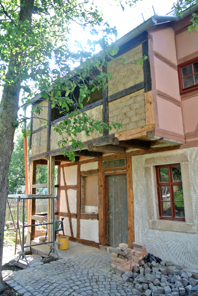 entfernten unteren Gefache wurden wieder mit Lehmziegeln geschlossen. Das Bild links zeigt die bereits teilweise mit Unterputz versehenen Gefache.