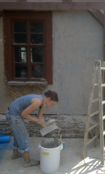 An den übrigen Stellen ergänzten wir den fehlenden Lehmschlag in der bereits an der Südseite (siehe 2012) erprobten Weise. Unser in den letzten Jahren gesammelter Alt-