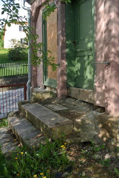 Parallel zu den Arbeiten am Gartenhäuschen wurde auch der Wegebereich unterhalb des Hauses Nr. 10 endlich in Ordnung gebracht. Zum einen musste die alte Treppe zum Laden abgebrochen werden, da die Stufen nur noch lose herumlagen (Foto links). Ohnehin hatte die Treppe früher eine andere Form und so entschlossen wir uns, im Zuge des Neuaufbaus die Treppe so anzulegen, dass man direkt von der Straße aus hinauf-