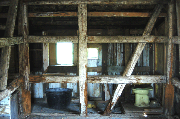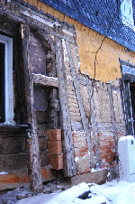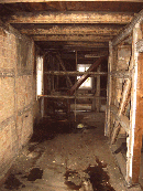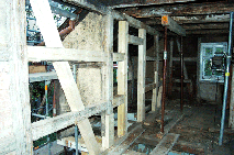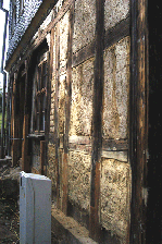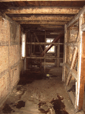 Das Foto links zeigt z.B. die nördliche Außenwand im Obergeschoss mit freiliegendem Fachwerk im Bereich des Laubenganges (die hier ehemals eingebaute Toilette ist noch zu sehen) An dieser Stelle hatte es jahrelang reingeregnet, so dass die Fachwerkhölzer wie auch Teile des Fußbodens hier kaum mehr zu retten waren.