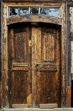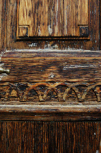 Unsere schöne, originale Haustür ist nun also wieder an Ort und Stelle, nachdem viele alte Farbschichten entfernt wurden und der Tischler sie wieder in einen stabilen, funktionstüchtigen Zustand versetzt hat. Dies war glücklicherweise mit relativ wenig Verlust an Originalsubstanz zu bewerkstelligen. Nachdem nun die Altanstriche verschwunden sind, erkennt man noch besser die schöne, filigrane Arbeit der damaligen Tischler. Die unteren Füllungen sind aufwendig geriffelt, in der Mitte verläuft ein Ornamentfries aus Halbkreisen. Dieser musste am linken Türflügel teilweise ergänzt werden, da hier jemand in der Vergangenheit recht rücksichtslos einen Briefkastenschlitz eingesägt hatte. Nun wurde die Holzoberfläche erst einmal geölt, so dass sie einige Zeit der Witterung zu trotzen vermag, bis dann später die neue Farbfassung aufgebracht wird. Auch einen schönen, historisch passenden Messingbeschlag haben wir finden und einbauen können.