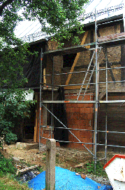 Eine große Aufgabe war auch der Abriss eines Anbaus an der Hinterseite des Hauses. Dieser war ehemals als Remise errichtet wurden und später über die Jauchegrube erweitert wurden. Es handelte sich um ein recht abenteuerliches „Gebau“ ,teilweise aus Ziegelwänden, teilweise nur als Holzschuppen. Richtige Fundamente gabe es auch nicht. Sowohl das Ziegelmauerwerk als auch die Hölzer waren bereits stark schadhaft, der Anbau drohte demnächst einzustürtzen. Ein weiterer wichtiger Grund, ihn abzutragen, war, dass wir sonst kein Gerüst an die östliche Rückseite des Hauses hätten stellen können, und gerade hier waren die meisten Schäden an den