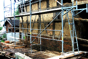 Die Ostseite des Hauses war die Seite, mit den übelsten Holzschäden. (Früherer Hausbockbefall) Viele Fachwerkständer und Riegel mussten angeschuht bzw. ganz ausgetauscht werden, bevor wir im Sommer damit beginnen konnten, die Gefache , welche unser Vorbesitzer schon entfernt hatte, wieder zu vermauern. Ursprünglich waren hier Staken eingesetzt gewesen, was man an den Nuten der Riegel noch erkennen konnte) und mit Strohlehm verschmiert worden. Wir nahmen stattdessen Leichtlehmziegel (Lehm/Hanfgemisch). Das Ausmauern mit den Lehmziegeln geht etwas schneller als das Ausfachen mit Strohlehm, der größte Vorteil ist jedoch die wesentlich kürzere Trocknungszeit.