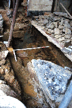 Fachwerkhölzern vorhanden. Auf dem Foto sieht man noch die ehemaligen Fundamente und Überbleibsel des Fussbodens im Anbau. Innerhalb des Anbaus war die Fassade des Haupthauses nie verputzt worden: man sieht wunderschön die originalen Lehmgefache, welche natürlich, auch aufgrund der Einregnungen der letzten Jahre, stark abgewittert sind. In der untersten Gefachereihe finden sich anstatt Lehm Ziegelausmauerungen, von denen wir noch nicht so ganz wissen, ob sie original sind (wegen der Granitschwellen) oder ob Sie später einmal ersetzt wurden (evtl. mit den Granitschwellen zusammen, da die alte Holzschwelle verfault war??!)