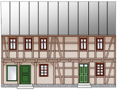 Steinhaus“ an, auch wenn man sich nur ein „billiges Holzhaus“ leisten konnte. In unserem Farbentwurf sieht man nun doch einen gewissen Kontrast zwischen Fachwerk und Gefachen, einfach auch, weil wir unterschiedliche Farbmaterialien verwenden möchten, da Kalkfarbe auf Holz definitiv nicht sonderlich lange hält. Auch finden wir ein bisschen „Fachwerkcharakter“ doch ganz schön..... Für die Fenster haben wir ein Dunkelrot gewählt, welches so auch an den ältesten Fenstern nachgewiesen werden konnte. Für die Türen war die Entscheidung schwieriger, da sie ja aus unterschiedlichen Zeiten stammen (Haustür bauzeitlich um 1822, Ladentür um 1892). Wir entschieden uns für ein auf allen Türen gefundenes und auch gut passendes Grün.