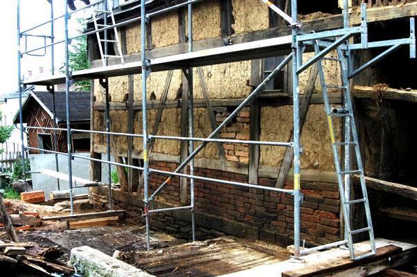 Viele Arbeiten haben sich in der letzten Zeit im „Unsichtbaren“ abgespielt: Sockel mussten ausgegraben, repariert und verstärkt werden, marode Wände wurden eingerissen. Aber auch gut sichtbare Ergebnisse liegen vor: die Küchenwand steht wieder inklusive eines Fenstergewändes aus Granit. Die Untermauerung des Laubenganges ist teilweise abgerissen und die meisten Gefache der Südseite sind wieder verschlossen. Auch unsere schöne Haustür ist wieder an Ort und Stelle. Nun soll es zwar nicht in größeren -