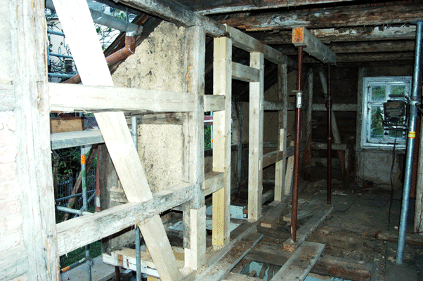Auch im Inneren ist 2011 einiges geschehen. Auch wenn das Hauptaugenmerk natürlich zuerst auf der Fertigstellung der Fassade liegt, sind dabei dennoch oft auch Arbeiten im Inneren gleichzeitig zu bewältigen, da diese in engem Zusammenhang stehen. So müssen bei Zimmermannsarbeiten an den Außenwänden natürlich auch immer im Inneren Wandverkleidungen, entfernt, Putze abgeschlagen. Sockel ausgegraben werden.