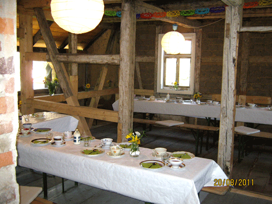 Die beiden folgenden Bilder zeigen nun das Obergeschoss Ende August, als alle Zimmermannsarbeiten und auch die Gefacheausmauerungen abgeschlossen waren. Wir nutzten die durch die noch fehlende Treppe zum Dachgeschoss (zur Repratur beim Tischler) großzügigen Räume für eine gemütliche Familienfeier.